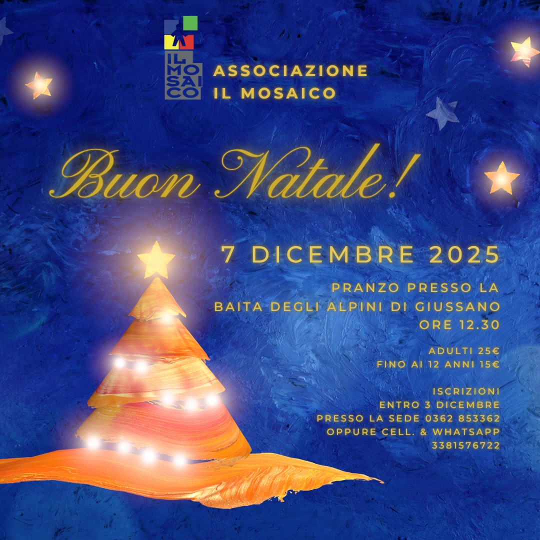 Domenica 7 Dicembre 2025 ore 12,30. Pranzo di Natale!! L’invito è rivolto a tutti coloro che vogliono trascorrere un momento di festa con gli amici della Associazione Il Mosaico. Tutte le informazioni sono presenti nella locandina allegata. adulti 25€fino ai 12 anni 15€ Iscrizioni entro 3 dicembre presso la sede 0362 853362oppure Cell. & WhatsApp 3381576722
